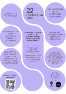 Tule siis mukaan 22.10. klo 12-15 paikan päälle Tampereelle kulttuuritalo Laikun musiikkisaliin tai liity mukaan etäyhteyksin. Ilmoittaudu mukaan tästä linkistä: https://link.webropolsurveys.com/EP/C49CB532EED20CC6